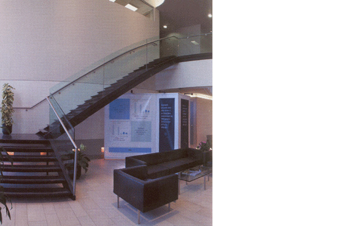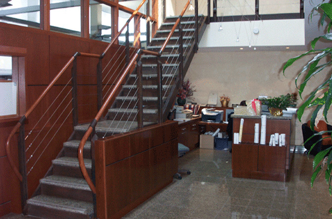 For its offices in Town of Mount-Royal, the contractor BROCCOLINI entrusted TRDM with the manufacture of these two metal staircases. One, made at right angles, has ramps made of metal pipes which are attached to the structure of the steps of the staircase; while the railings of the other staircase are made of a series of stretched steel cables.