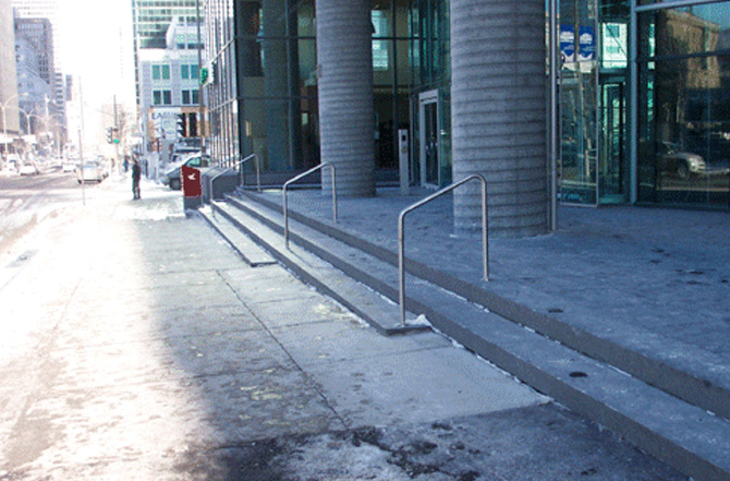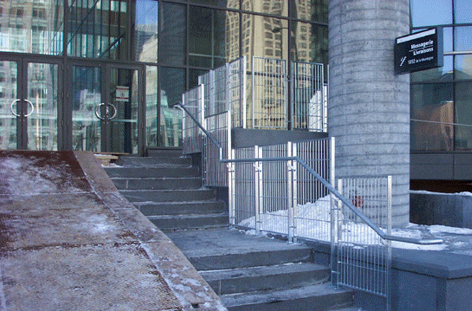 TRDM produced a series of metal structures to suit this project,  including the construction of stainless steel railings as well as other railings made for this entrance at Cité du Commerce in Montreal.