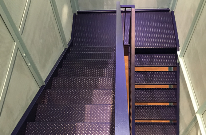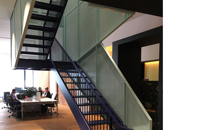 Pour les bureaux de la compagnie ADGEAR, une agence média à Montréal, Métaux TRDM a eu le contrat de fabrication des escaliers intérieurs reliant les deux étages de cette entreprise. Faits de métal peint à l'époxy, les marches de cet escalier urbain sont faites de plaques striées antidérapantes.